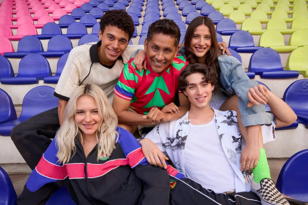Aunado a una paleta llena de fuerza entre tonalidades que van desde el verde limón, rosa vibrante, morado, azul eléctrico, rojo hasta el blanco que dialogan entre sí para crear looks con alto impacto, guiños nostálgicos y una energía optimista que remite tanto al fútbol de los noventa como al pulso cálido y desenfadado del futbolista.