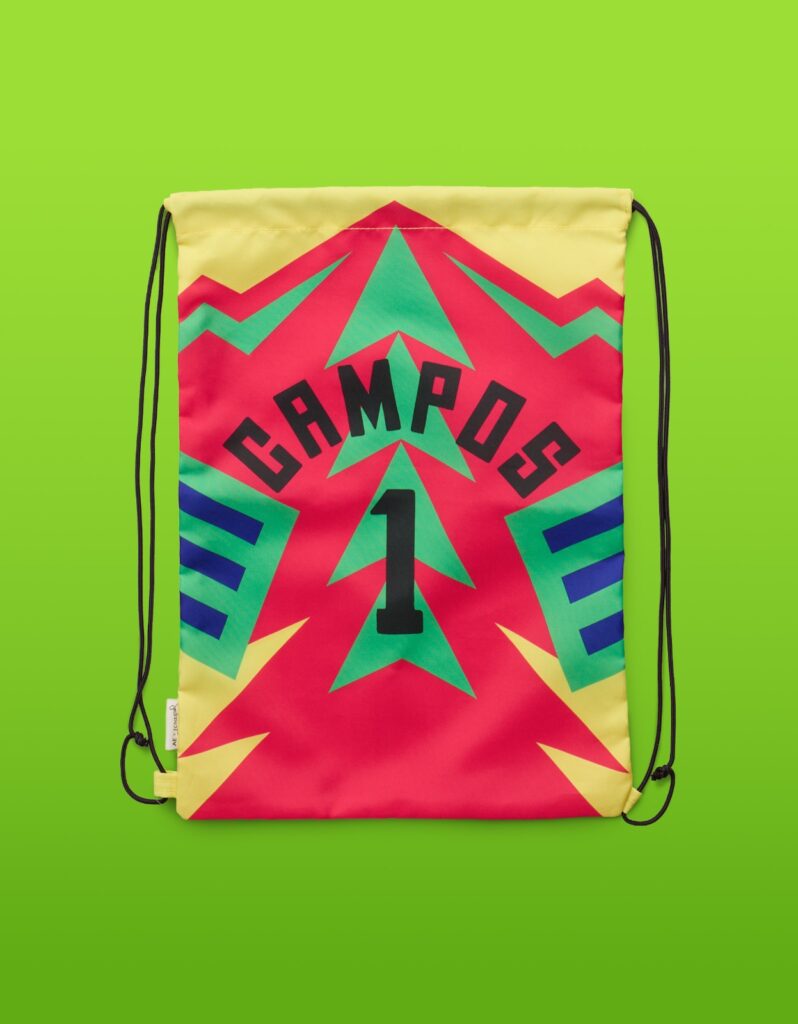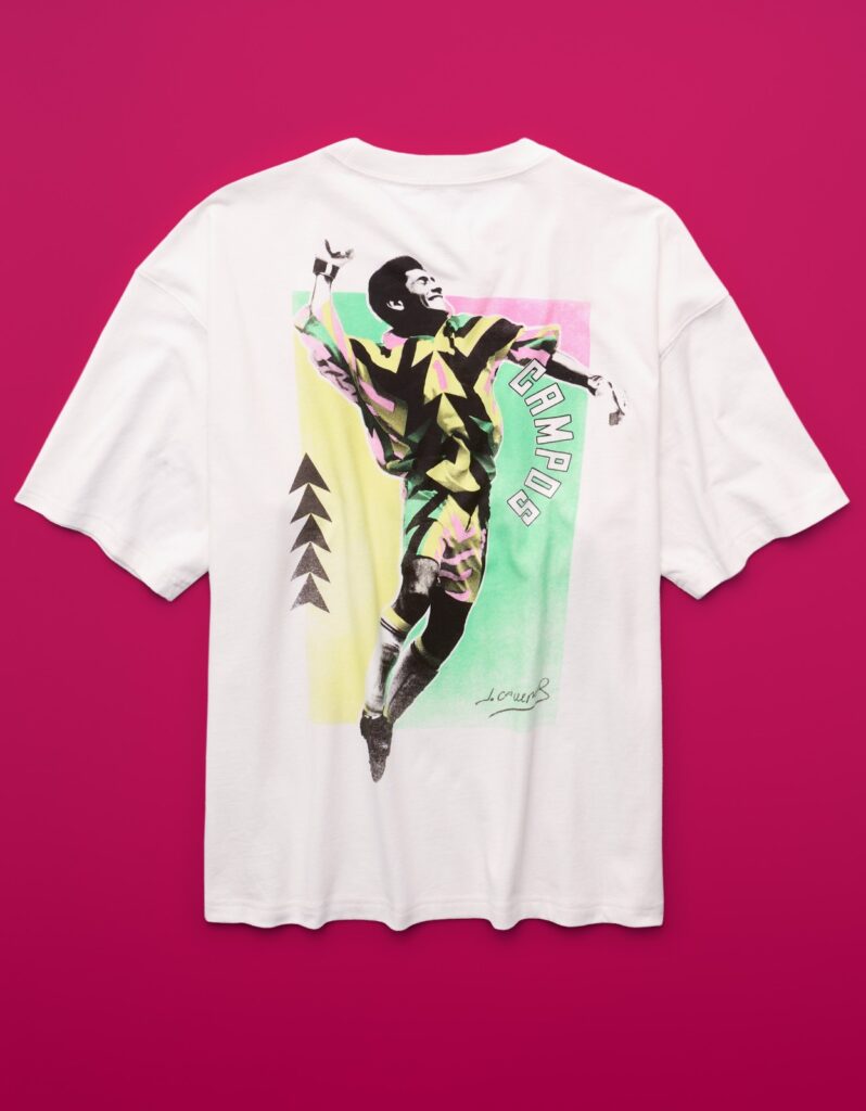 La colección incluye jerseys, playeras gráficas, gorras, calcetines y flip flops que reinterpretan la esencia de Jorge Campos desde una mirada contemporánea, siendo así una propuesta con sensibilidad retro y acento deportivo, donde los códigos del fútbol se encuentran listos para salir de la cancha a la calle.