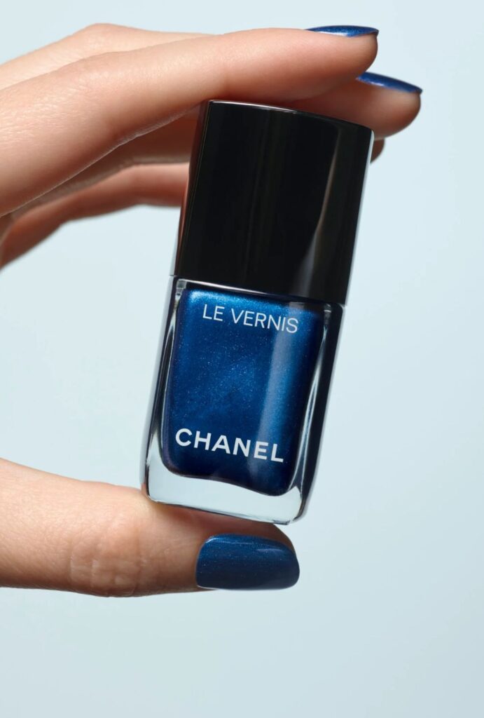 El esmalte Le Vernis Légende captura la intensidad del denim crudo en un azul metálico con efecto espejo.