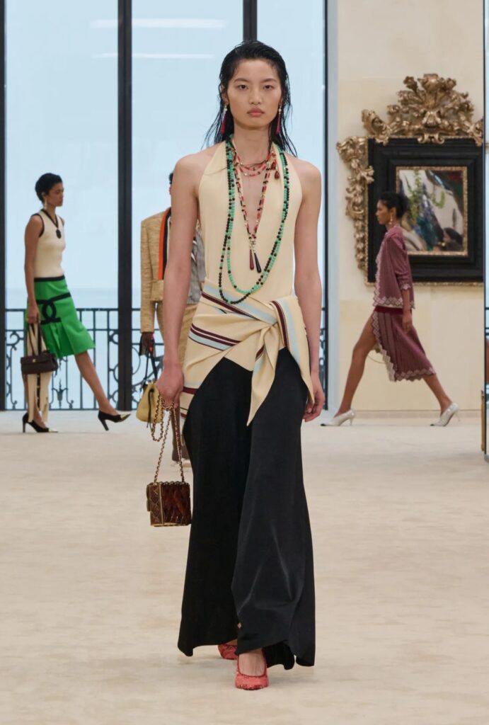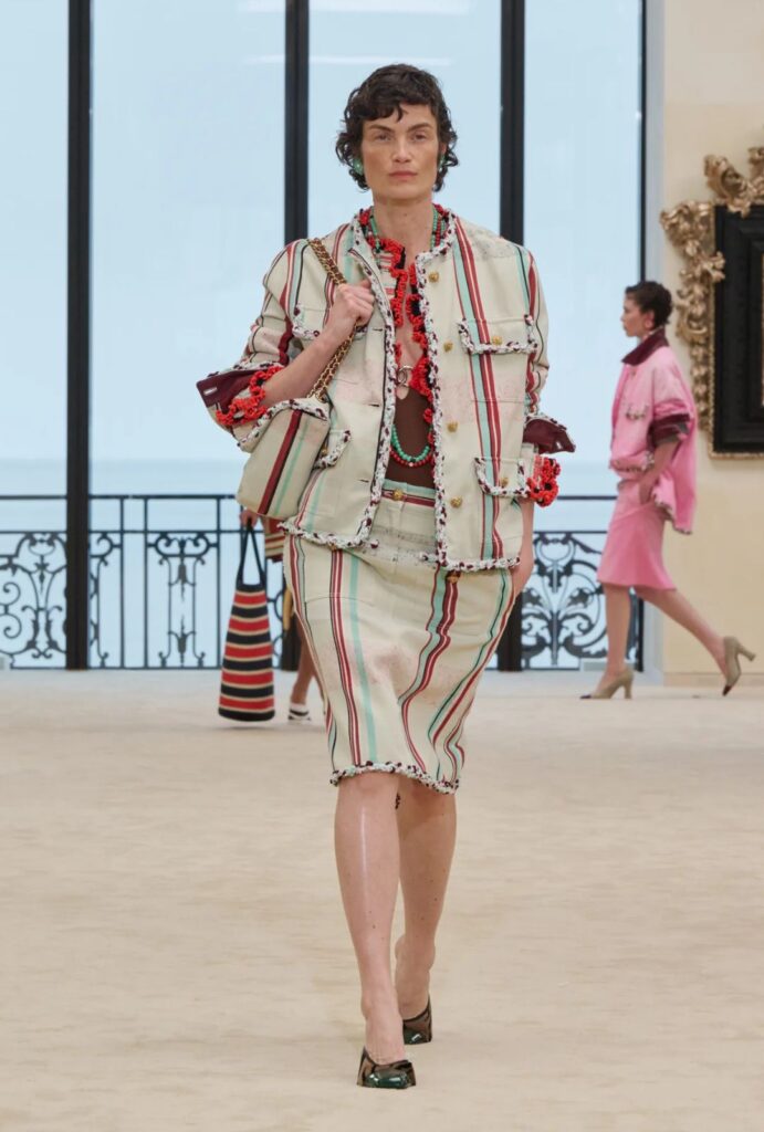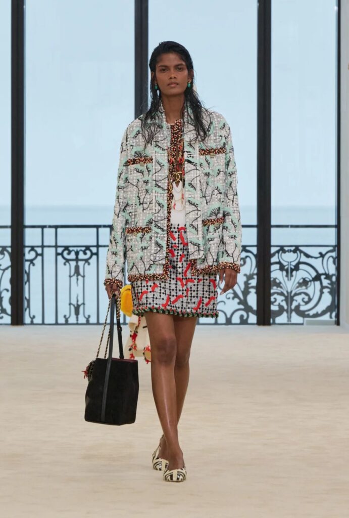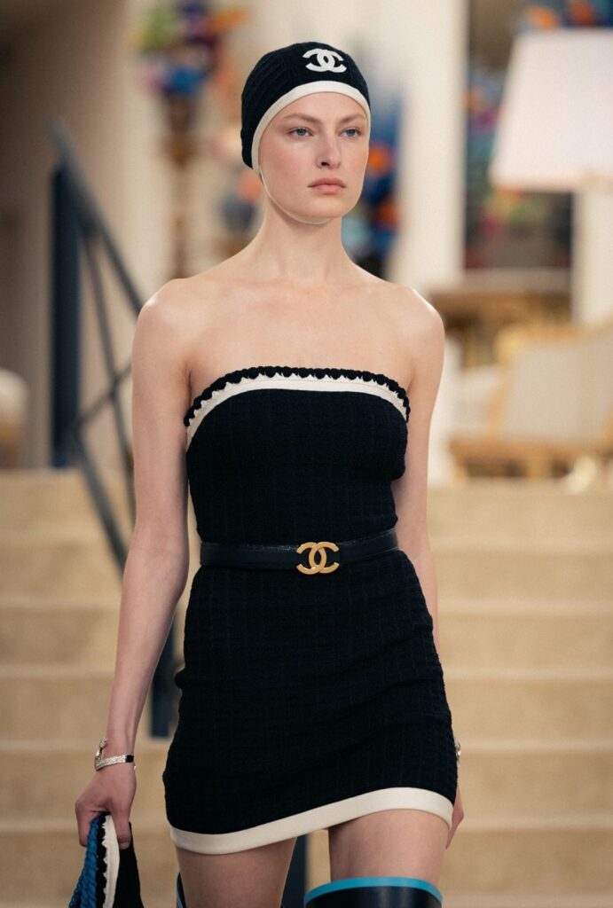 La inspiración de la colección nace de un doble gesto: el regreso a los orígenes de la Maison en Biarritz y la lectura contemporánea que hace Matthieu Blazy de ese imaginario. Biarritz no es solo un destino, sino el punto donde Chanel empezó a construir una nueva idea de modernidad en 1915, cuando Gabrielle Chanel abrió allí su primera casa de alta costura.