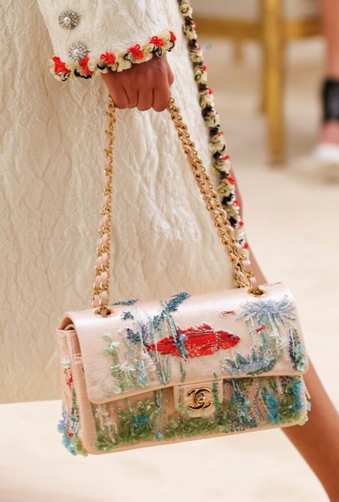 En este verano de Chanel, los bolsos se convierten en piezas protagonistas: desde totes de paja con rayas multicolor y el logo reinterpretado, hasta versiones de viaje en contrastes bicolor que evocan una elegancia en tránsito, sin destino fijo. También aparecen bolsos bordados con motivos marinos (peces, algas, texturas casi pictóricas) que transforman el objeto en una pequeña escena portátil.