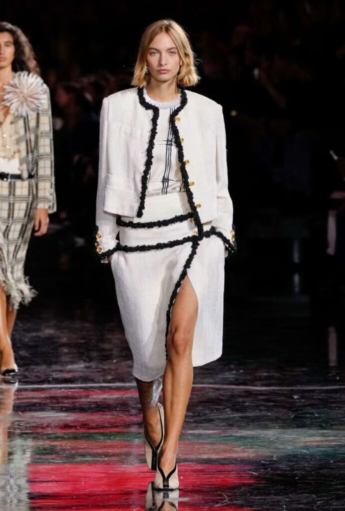 Blazy no ha revivido el archivo, sino su espíritu. Su punto de partida no es la nostalgia, sino la revolución silenciosa que Coco provocó cuando liberó el cuerpo femenino. Las chaquetas de tweed, los zapatos bicolor y las perlas siguen ahí, pero en esta versión el cuerpo respira distinto. Las cinturas bajan, los drapeados abrazan el movimiento y los flecos —herencia de su etapa en Bottega Veneta— evocan una feminidad que se desliza entre la historia y la irreverencia.