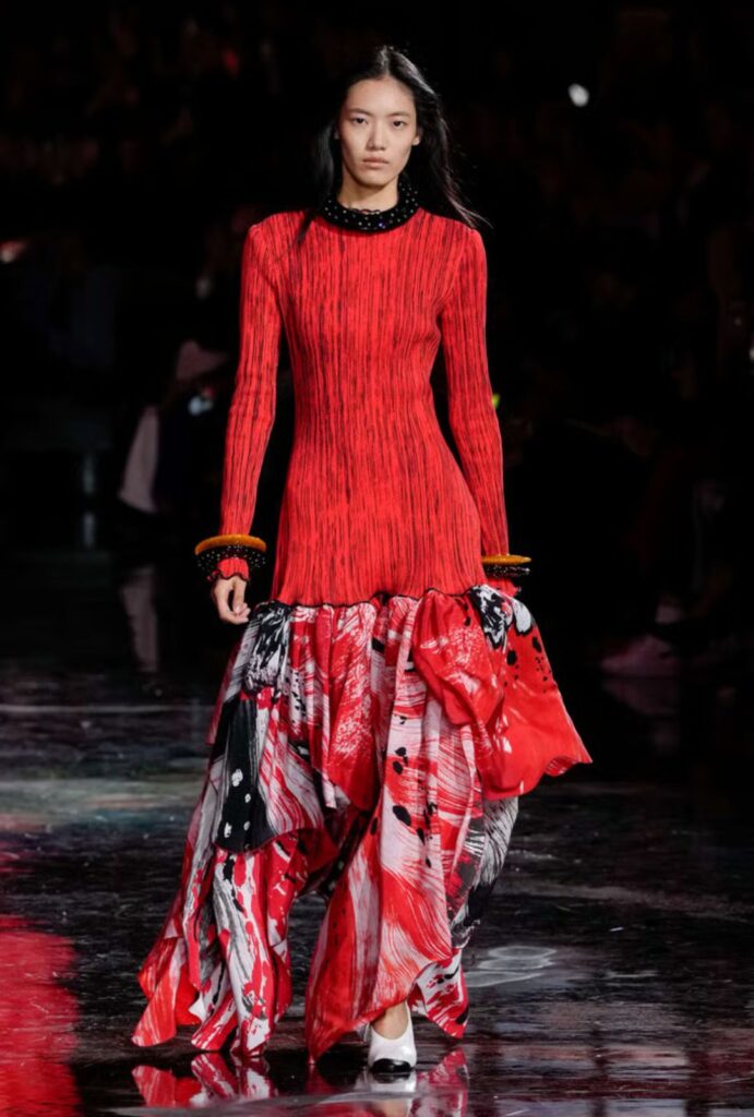 La paleta se expande más allá del blanco y negro. Hay reflejos de plata, oro y azul profundo, pero también irrupciones de naranja, fucsia y rojo encendido. Es el cielo en movimiento: amanecer, ocaso y noche en un mismo desfile. Las combinaciones cromáticas sugieren energía cósmica, mientras que las texturas metálicas capturan el brillo de las estrellas.