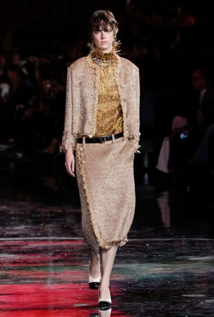 El tweed, emblema eterno de la casa, se aligera hasta parecer aire. Su textura bicolor apenas se distingue, como si el hilo quisiera desaparecer entre los reflejos de la luna. Chanel, por fin, se desencorseta otra vez.