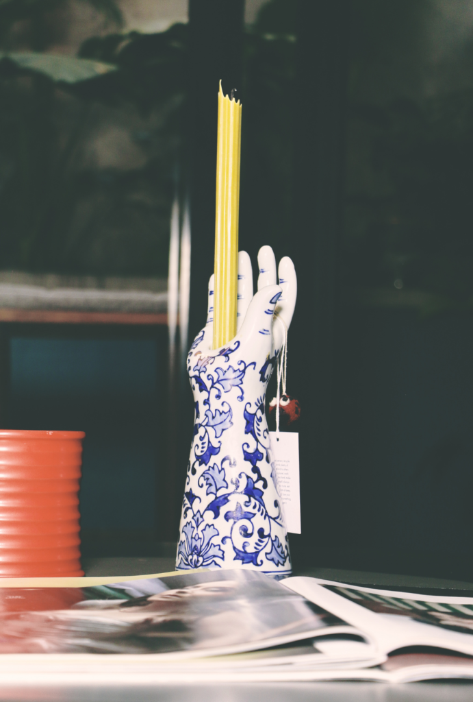 El tercer objeto es un portavelas en forma de mano, comprado en Países Bajos, que la conecta con su hermana: ‘Es muy simbólico que sea una mano y que esté abierta a recibir otra mano o algún regalo o para dar algo también. Un objeto que me encanta, que me representa’, describe, casi como una declaración emocional. Una pieza frágil, querida, que habla de su sensibilidad y de su deseo constante de conexión.