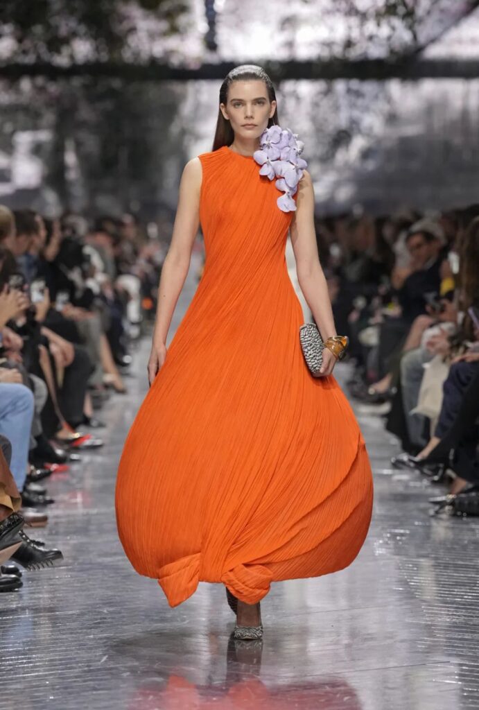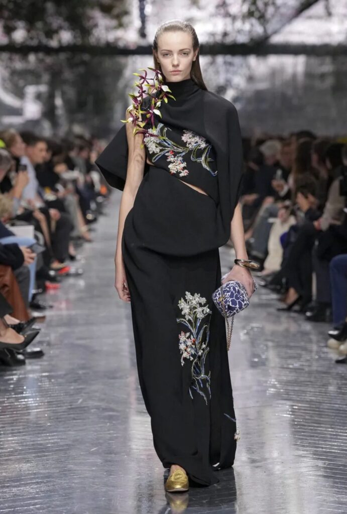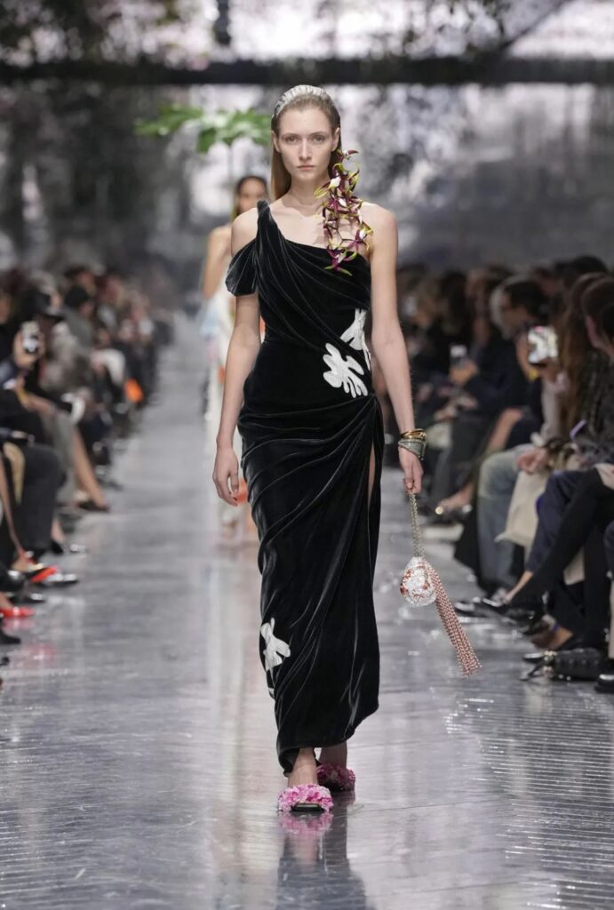 Anderson incorpora influencias orientales, guiños a Galliano y referencias a esculturas y fotografías contemporáneas, creando una colección maximalista y vegetal, sin perder ligereza conceptual.
