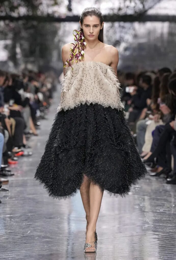 A lo largo del desfile, Anderson reinterpretó la alta costura como diálogo entre forma y movimiento: faldas que se ensanchan, vestidos que flotan y caen con control técnico, chaquetas que evocan la icónica Bar silhouette, todo fusionado con una atención obsesiva al detalle.