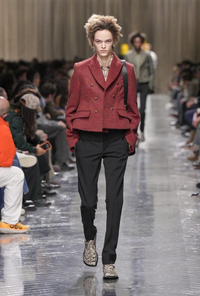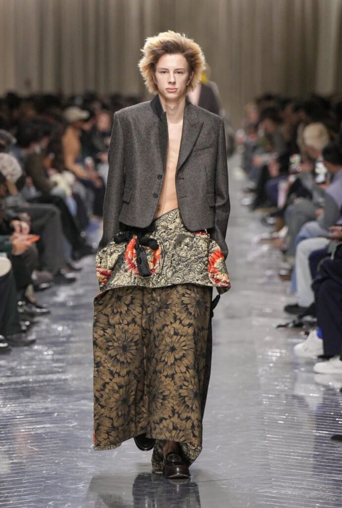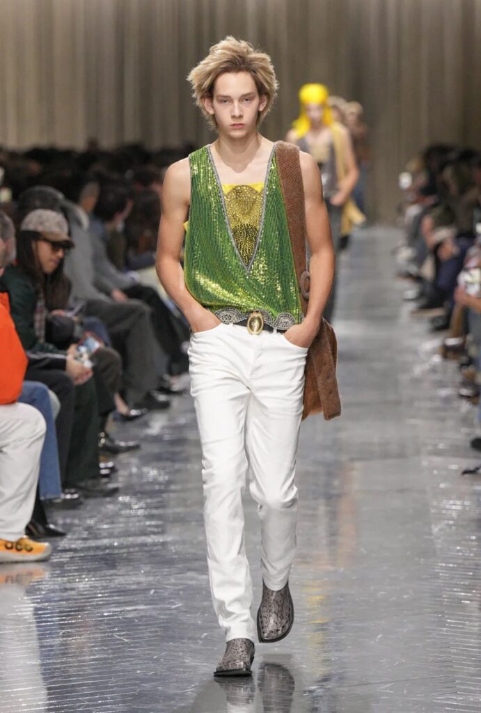 Las chaquetas se acortan, los abrigos se expanden, y los pantalones se ciñen como segunda piel. Anderson juega con la proporción, la caída y la textura, invitando a una nueva narrativa: el cuerpo masculino se suaviza, lo femenino se integra, y la ropa parece respirar con quienes la llevan. Desde vestidos midi para hombres hasta faldas voluminosas y tops de lentejuelas, cada pieza es un manifiesto de libertad.