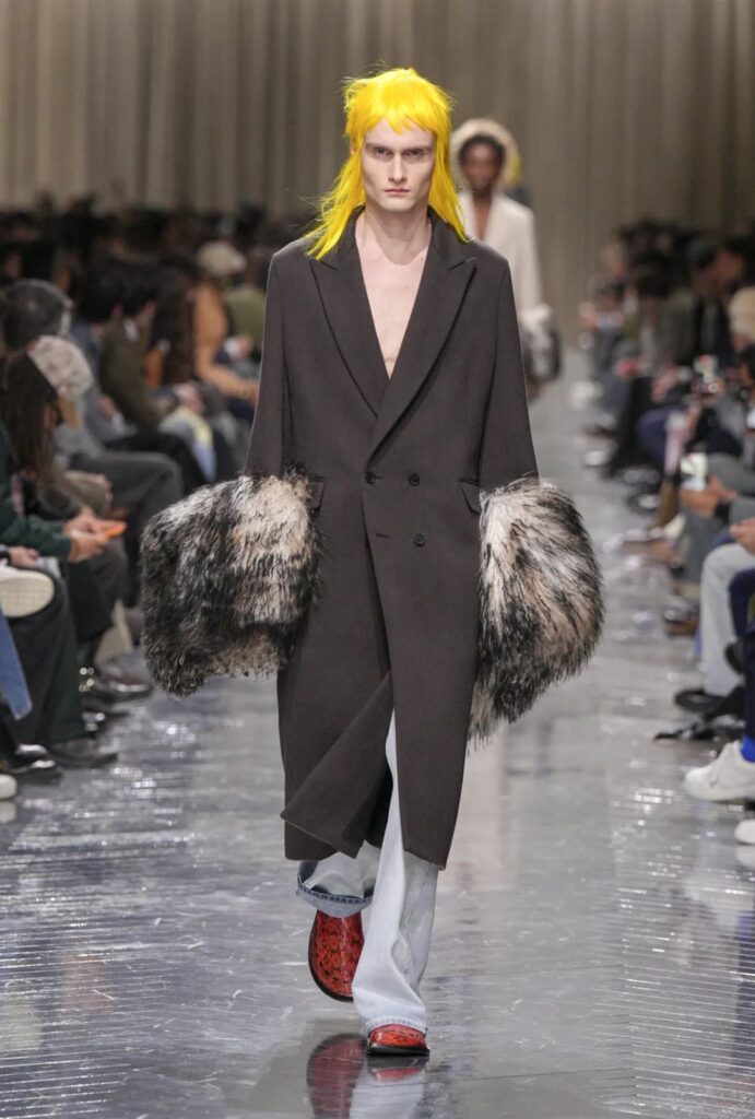 El pelucas amarillas de Guido Palau y los rostros serenos de Peter Philips crean un contraste dramático con la sastrería precisa y los volúmenes audaces. La colección respira juventud aristocrática, mezcla tradición y rebeldía, y propone una nueva masculinidad y feminidad libres de reglas.
