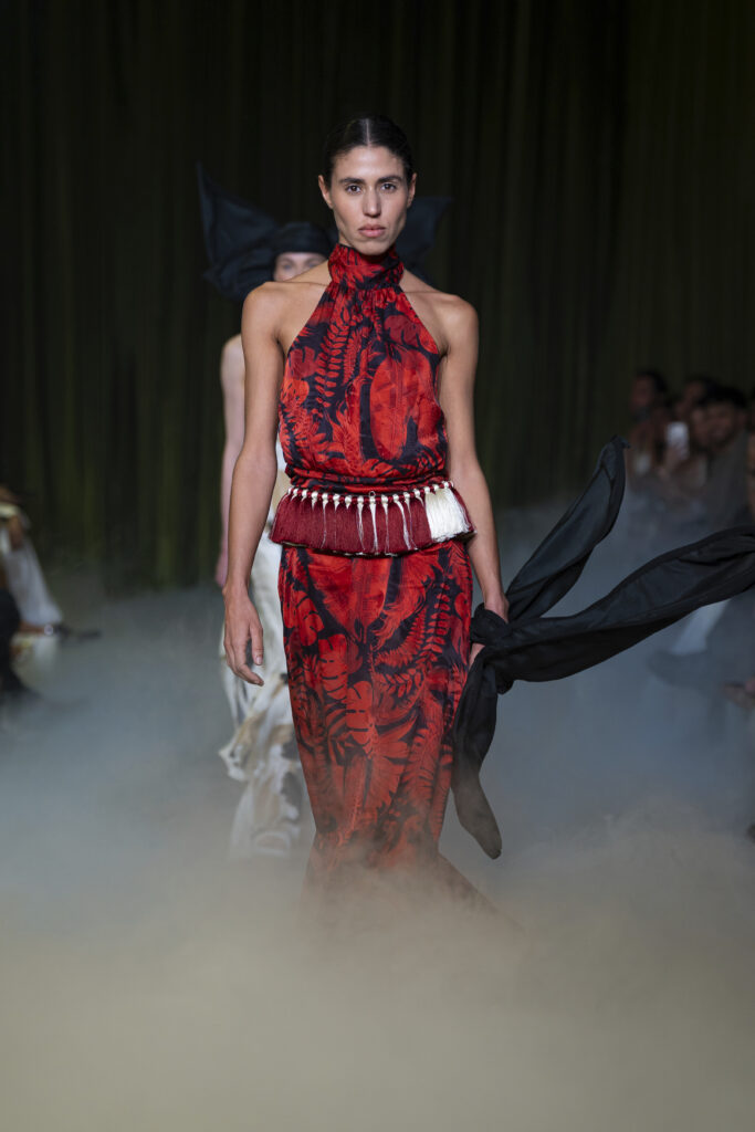 Juan de Dios también se decantó por subir al escenario su última colección, Resort 2026, en la que las flores y los estampados grandes destacan. De cada pieza destacaron las capas, los escotes profundos y los cortes irregulares. Con su desfile, Juan de Dios exaltó lo que siempre ha querido, ‘la belleza indómita del Pacífico colombiano, donde la selva se encuentra con costas vírgenes y el tiempo parece detenerse’.