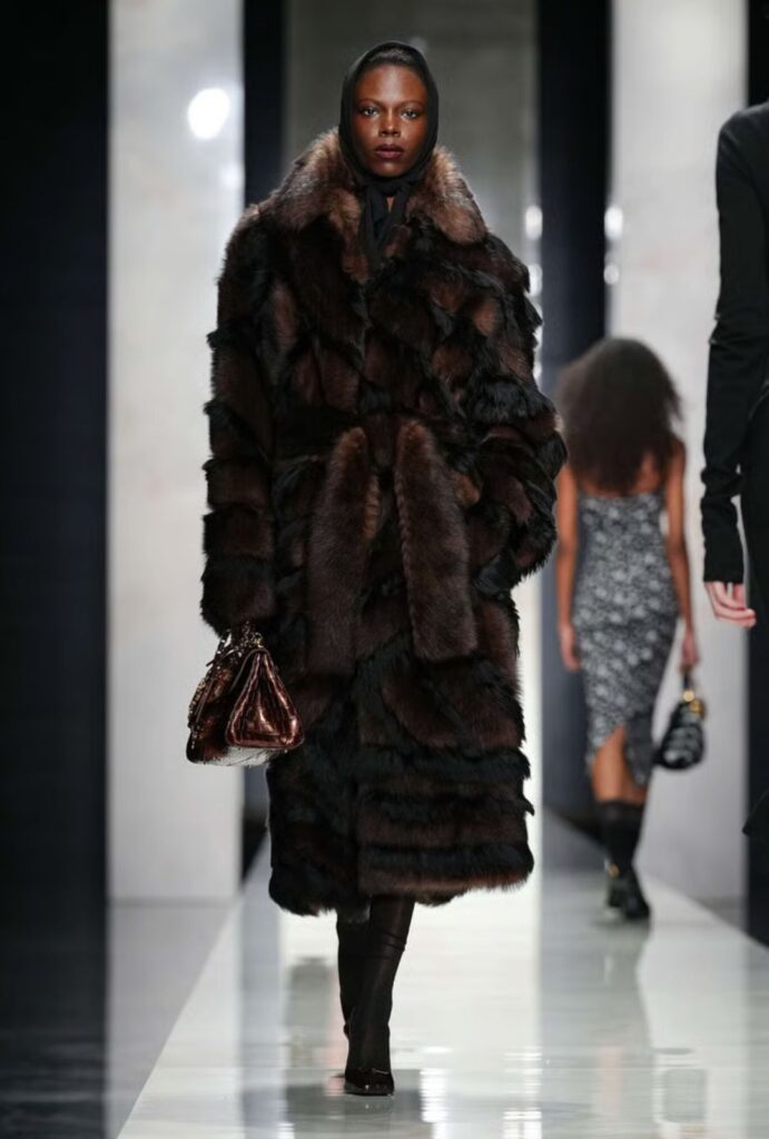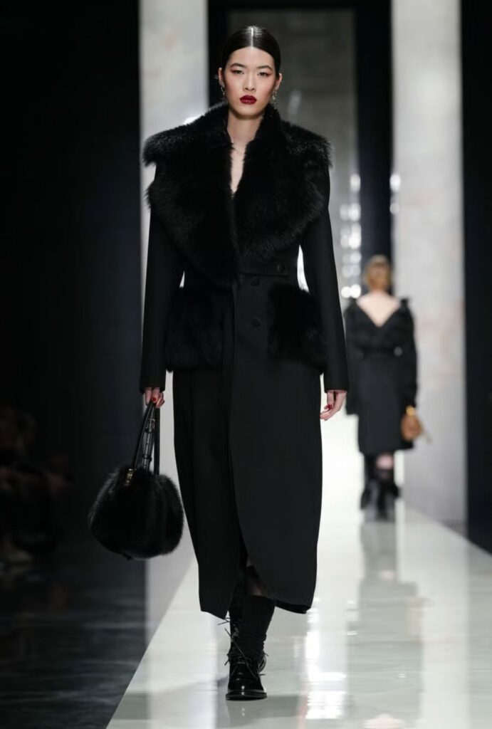 El negro dominó casi el 85% de los looks. No como ausencia de color, sino como declaración de elegancia atemporal. Satén, lana, gasa, encaje y charmeuse dialogaron dentro de una misma tonalidad creando profundidad sin estridencia. Junto al negro emergieron marrones cálidos, discretos, envolventes.