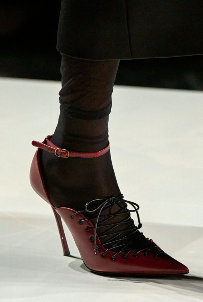 Zapatos bajos con cordones de inspiración masculina convivieron con stilettos afilados. Calcetines dobles sobre medias transparentes reforzaron la narrativa de capas y contraste.