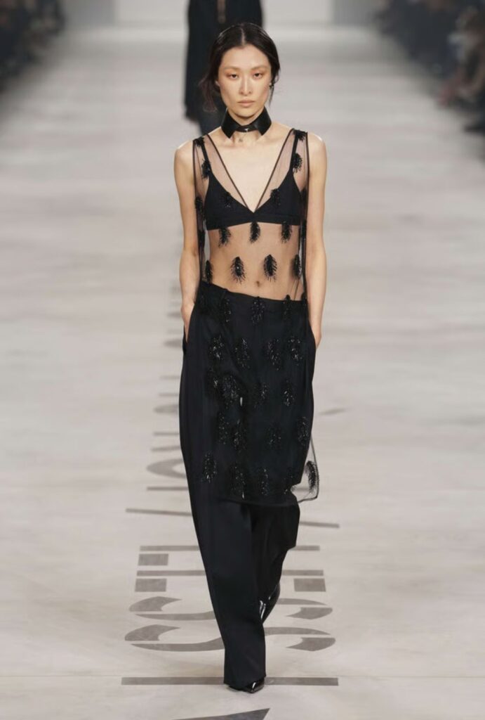 También se percibieron ecos de su etapa en Valentino y en Dior (especialmente en el uso del encaje, las siluetas midi y la tensión romántico-sastrera) pero con una energía más cruda, menos manifiesto y más estructura.