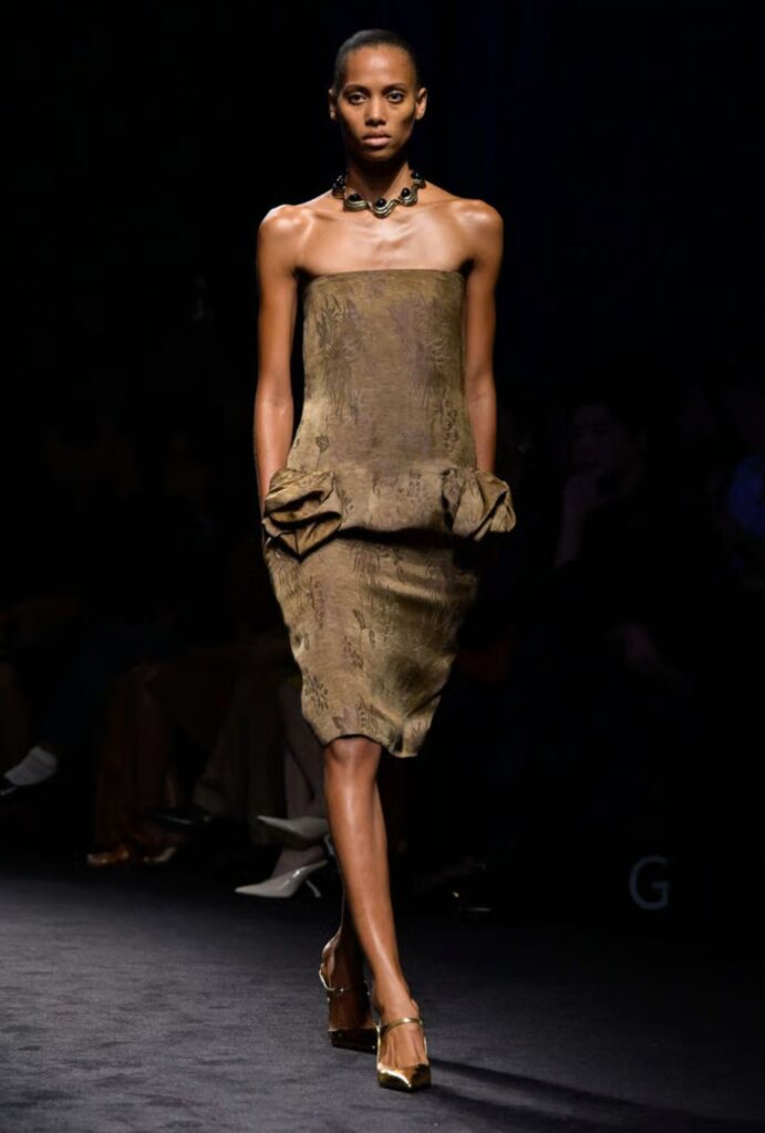 Los vestidos de lamé dorado fueron un punto de inflexión. Volantes esculpidos y raso brillante generaron un juego de luces que evocaba la historia del arte, mientras que la silueta se volvió más teatral y audaz.