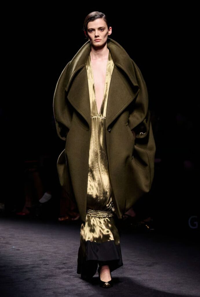 Los vestidos dorados con volantes esculpidos aportan dramatismo, mientras que gabardinas, nylon y detalles urbanos equilibran tradición y modernidad.