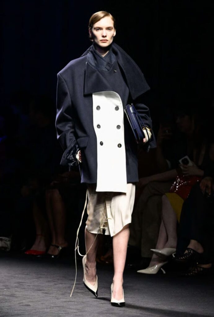 El primer bloque sorprendió con peacoats de cashmere azul marino, reinterpretando los uniformes marítimos clásicos. Paneles de seda marfil, líneas cubistas y cierres inesperados crearon un efecto deconstructivo, donde la funcionalidad se encuentra con la precisión arquitectónica.