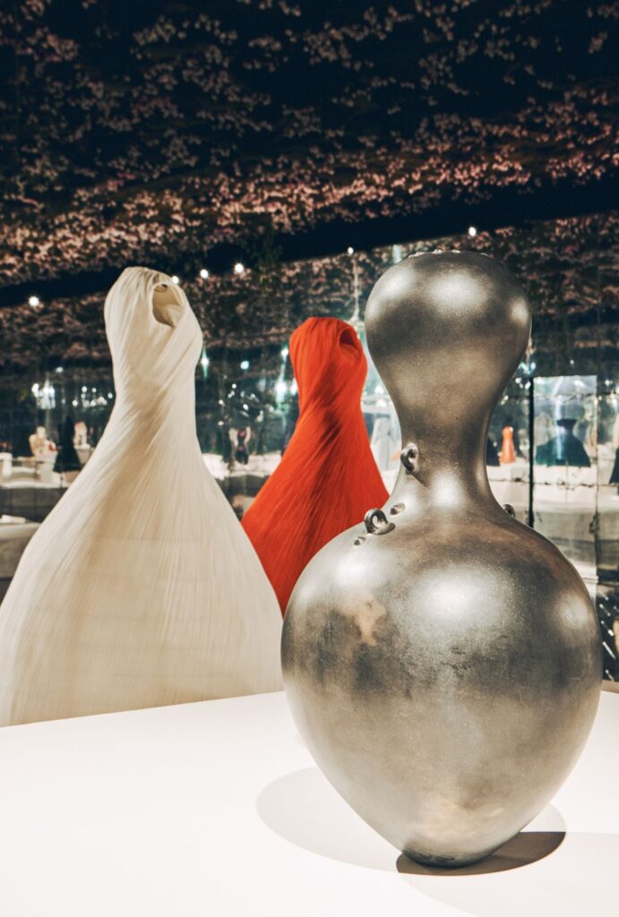 La muestra explora cómo la forma se construye, se repite, se exagera y se resignifica. Las siluetas icónicas de Dior (estructuradas, precisas, casi arquitectónicas) dialogan con nuevas propuestas materiales y con la poética escultórica de Odundo, donde la forma nace del gesto y del tiempo.