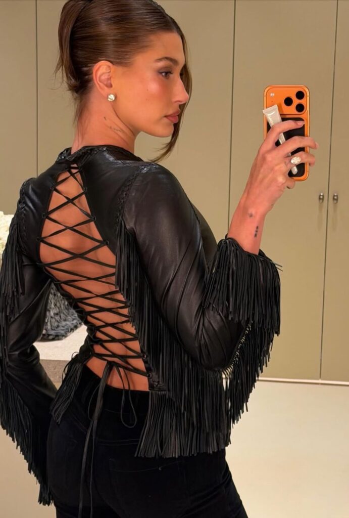 Con cremallera frontal, escote profundo, espalda abierta trazada por cordones y flecos que caían desde las mangas, la prenda funcionaba como protagonista absoluta. Era una pieza que no solo se llevaba puesta, sino que se interpretaba. Hailey la llevó con ese control milimétrico de proporciones que domina tan bien.
