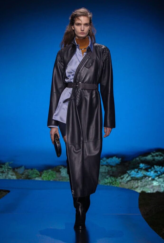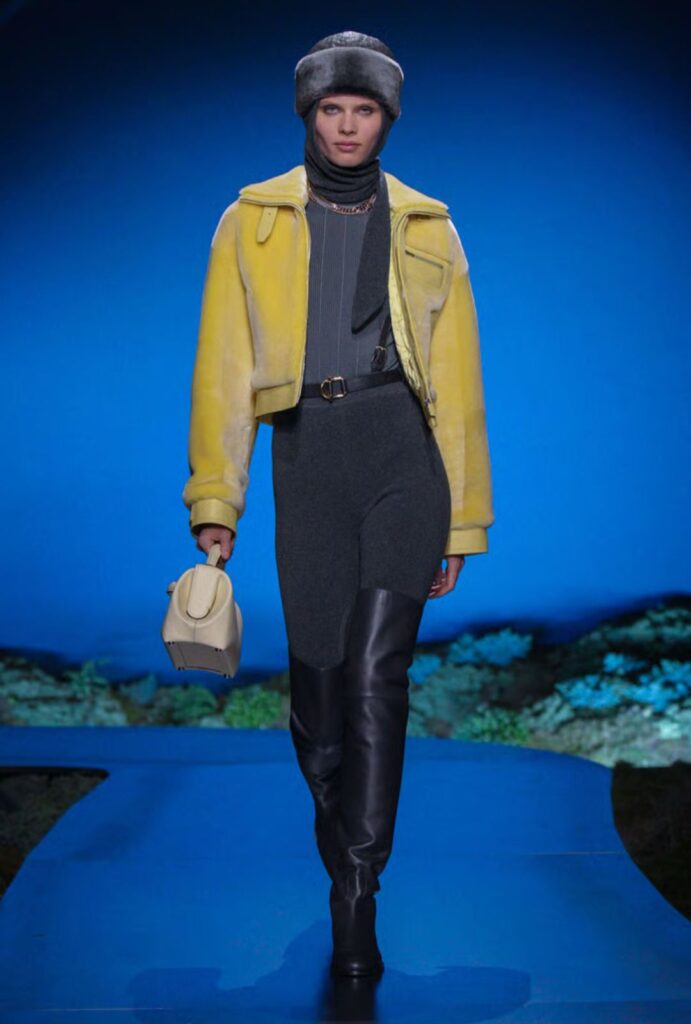 En Hermès destacan botas ecuestres hasta el muslo y botas planas diseñadas para moverse con rapidez, complementadas con sombreros cosacos negros y cinturones de cadena metálica que marcan la silueta.