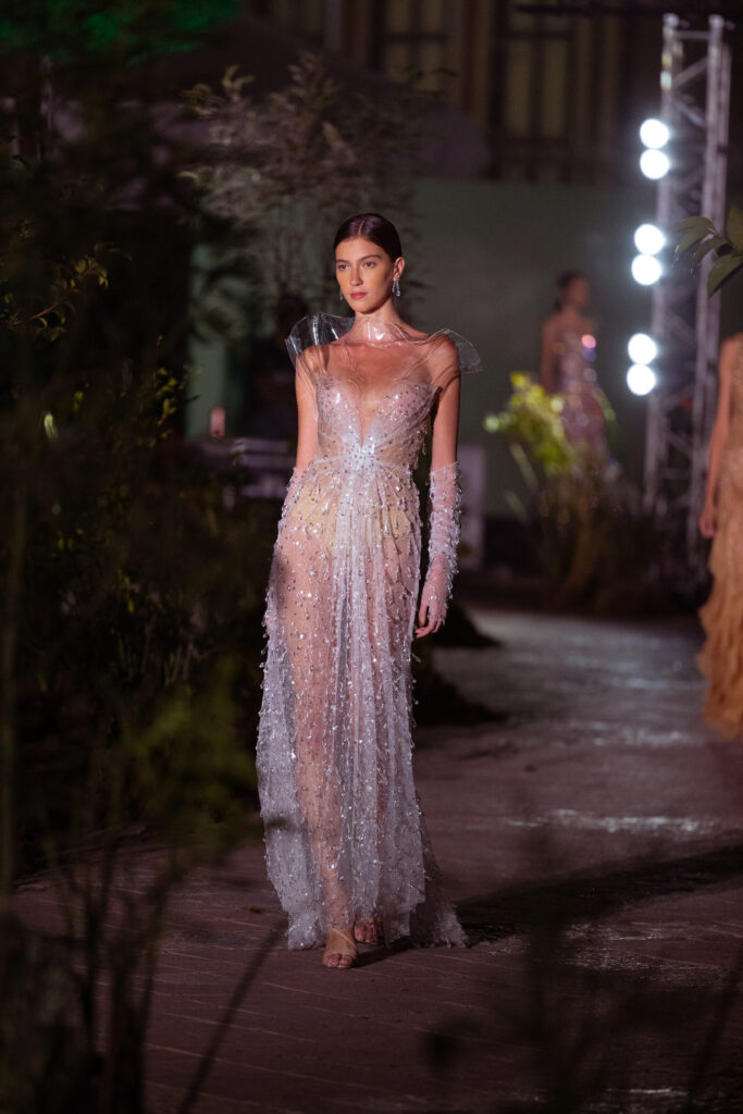 Los elementos clave que dominaron la pasarela se manifestaron, en primer lugar, a través de transparencias, donde el uso de textiles translúcidos permitió un sofisticado juego de capas que aportó ligereza y misterio a cada pieza.