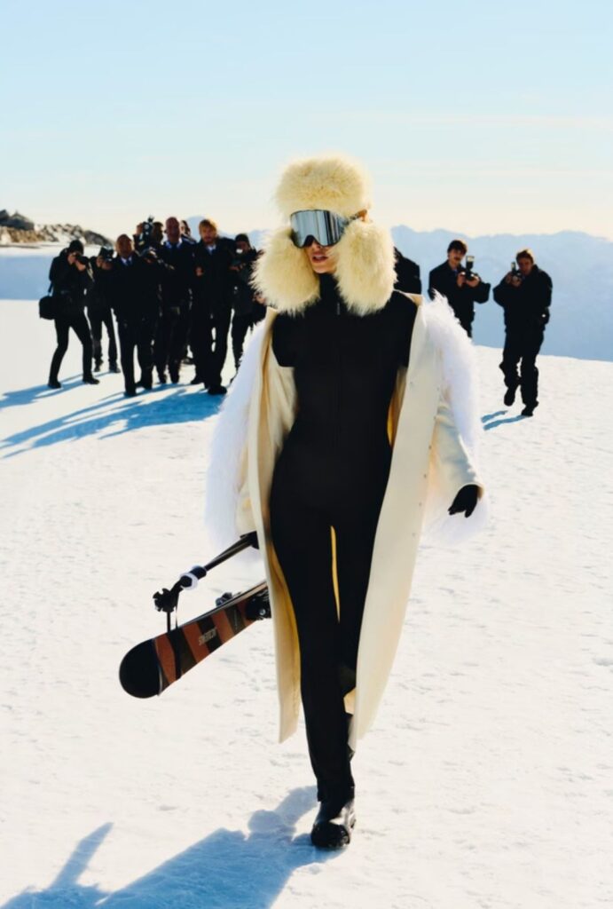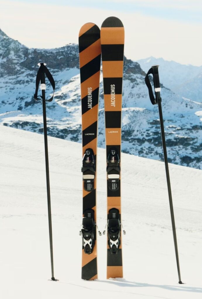 Jacquemus se asoció con Lacroix para crear esquís con rayas gráficas y máscaras a juego. Estos elementos no solo son funcionales, sino también coleccionables, mostrando cómo los accesorios pueden contar una historia de lujo en la nieve.