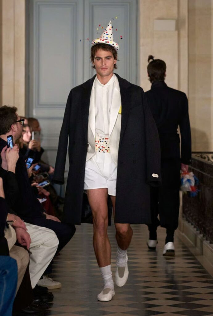 La propuesta masculina confirma su peso dentro de la Maison. Trajes reinventados, esmóquines fragmentados, solapas exageradas y materiales inesperados construyen un vestuario formal que no se toma demasiado en serio, pero sí muy en serio su ejecución.
