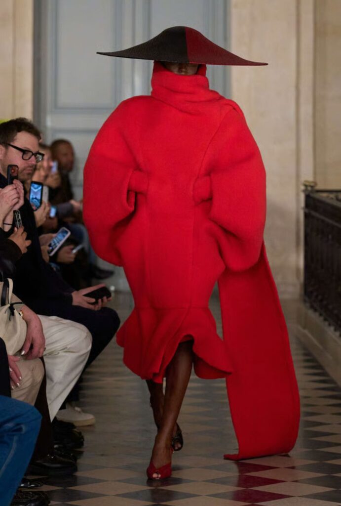 Más que un complemento, funciona como gesto teatral: amplifica las siluetas, refuerza el carácter lúdico del desfile y dialoga con esa feminidad exagerada que Jacquemus reivindica esta temporada.