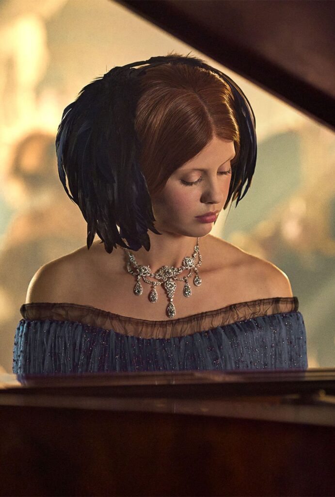 El diseño de vestuario de Kate Hawley establece un diálogo íntimo con las joyas: tejidos inspirados en formas orgánicas y siluetas melancólicas que se funden con el brillo de los diamantes. ‘Las joyas de Tiffany se convirtieron en una contribución creativa en sí mismas, tan esenciales como el maquillaje o la escenografía‘, señaló la diseñadora.