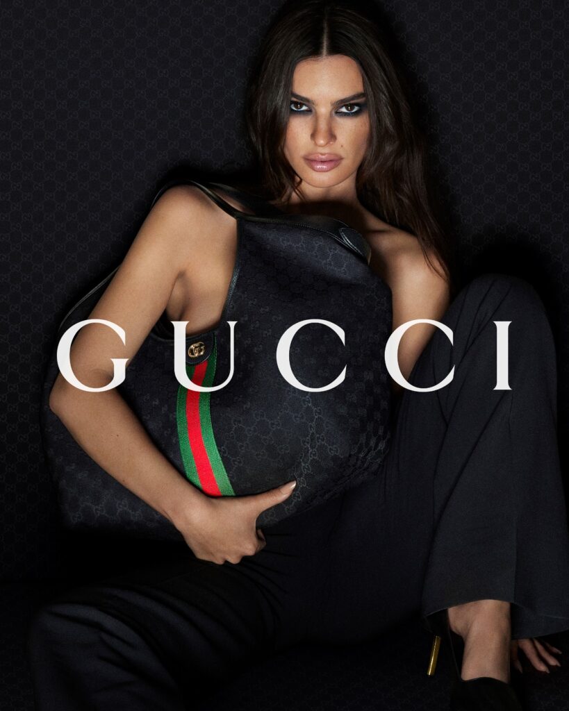 Tanto Kate Moss como Emily Ratajkowski aparecen en diversos retratos, vestidas con looks de Gucci que reflejan la identidad y el carácter de cada bolso, a la vez, el estilismo evoluciona desde lo minimalista hasta un total look GG en prendas y accesorios.