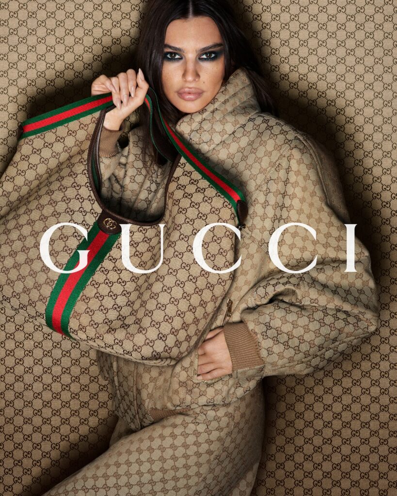 Emily Ratajkowski posa con el Giglio, aparece en tonos marrón oscuro, negro y el clásico GG Canvas.
