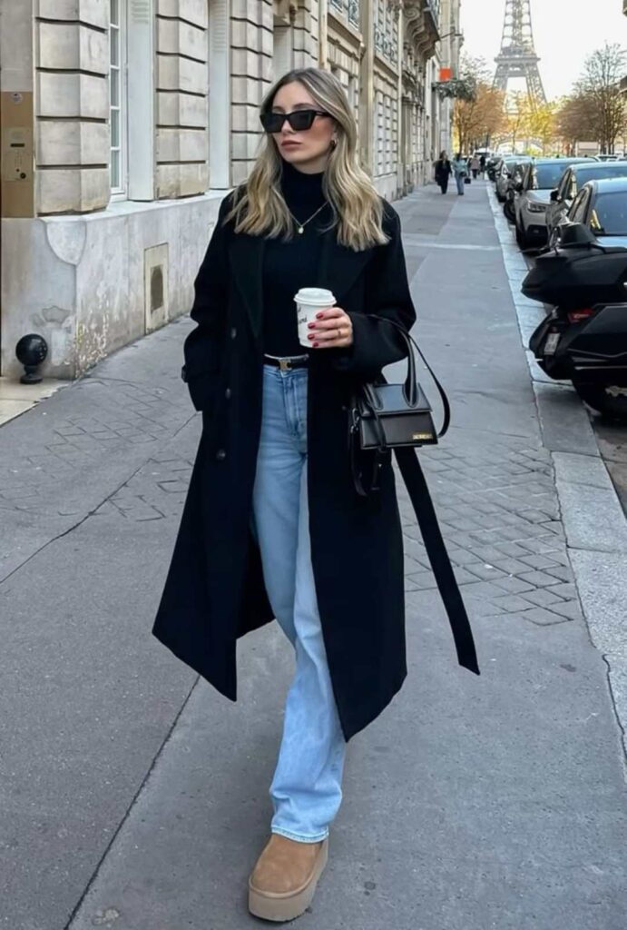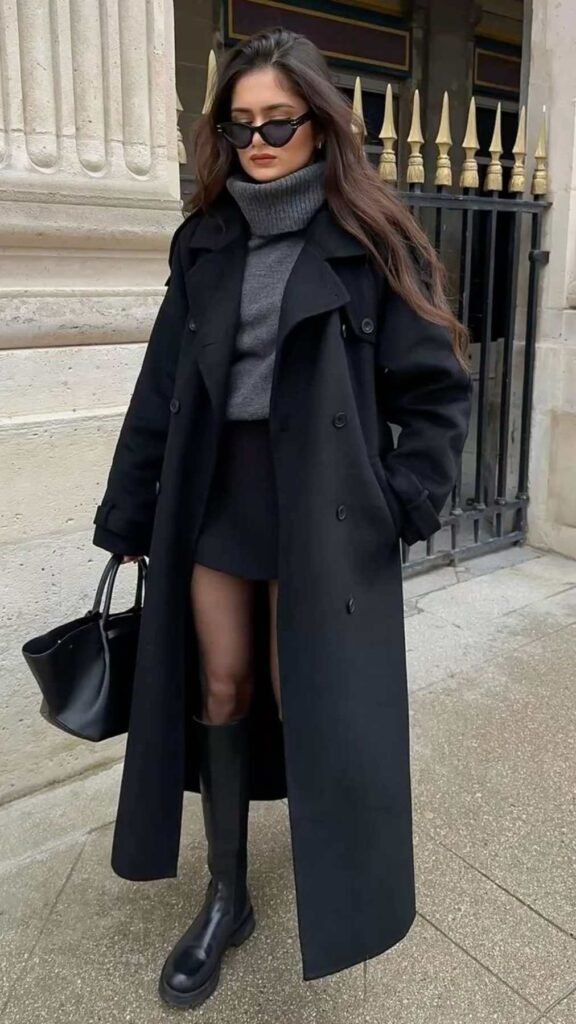Aquí está el truco para verte bien en el invierno 2025 sin morir de frío: un abrigo largo de tejido suave y negro.