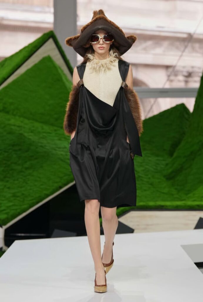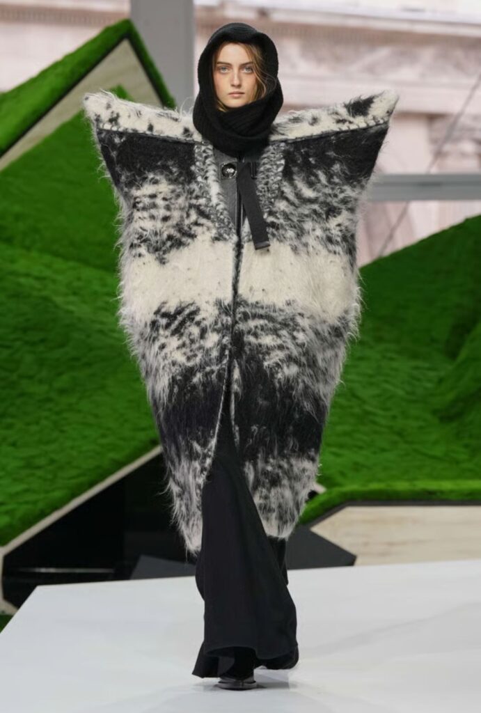 Lanas densas, shearling, pieles, tejidos técnicos, sedas pesadas y acabados metalizados convivían en prendas que parecían construidas a partir de fragmentos o capas superpuestas. Muchas piezas transmitían la sensación de estar compuestas por retales o elementos ensamblados: una estética deliberadamente imperfecta que remite al espíritu bohemio y artesanal.