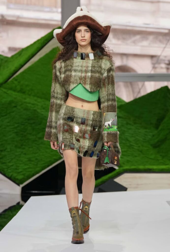 En el patio Cour Carrée del Louvre, Louis Vuitton volvió a transformar la última jornada de la Semana de la Moda de París en un espectáculo escenográfico. Bajo una estructura de cristal y rodeadas de picos verdes que evocaban montañas, praderas y relieves abstractos (una naturaleza reinterpretada, casi museográfica) las modelos caminaron sobre un paisaje conceptual que anticipaba el tono de la colección.