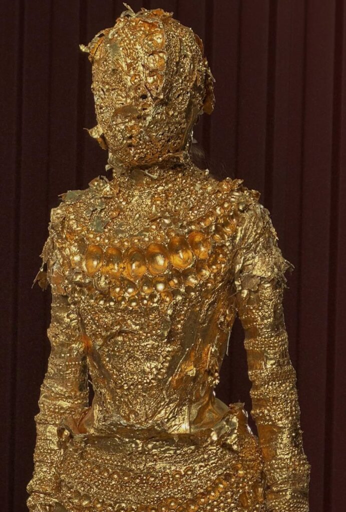 Técnicas como Bianchetto y el uso de cera, fragmentos de porcelana y textiles reciclados muestran la obsesión de Margiela por lo artesanal, pero reinterpretado para el presente.