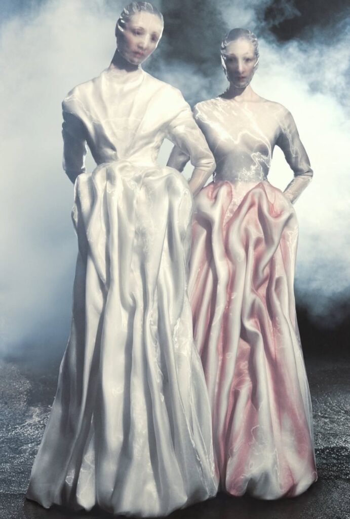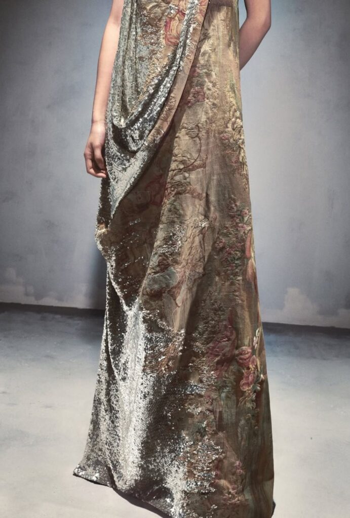Entre lo más impactante, los vestidos que crujen y chirrían al moverse, hechos con mosaicos de porcelana, y los fragmentos de vestidos eduardianos que se integran en siluetas modernas, demostrando que el revival histórico sigue siendo tendencia. La sastrería de cuero deconstruida, los vestidos envolventes y las telas quemadas o desgarradas muestran cómo la experimentación textil y el look artesanal se fusionan con la modernidad.