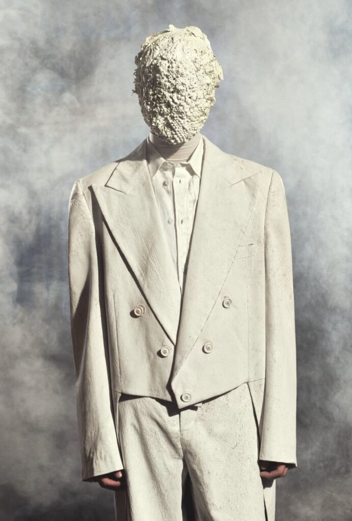 FW26 reafirma el legado de Margiela a través de las máscaras, que no son solo un detalle, sino el corazón del look. Cubriendo rostros y transformando identidades, equilibran misterio y sofisticación, mientras reinterpretan el anonimato como tendencia contemporánea. Cada máscara, meticulosamente elaborada, se convierte en un objeto artístico, completando los vestidos escultóricos y reforzando la performance de la pasarela.