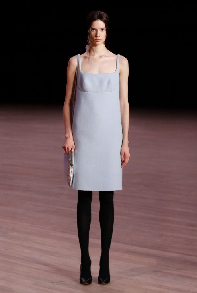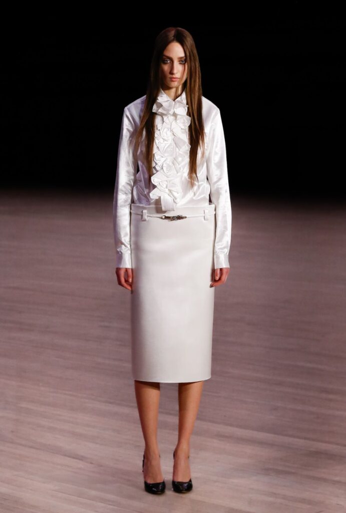 El SS26 marca un giro desde las formas oversize y vanguardistas de temporadas anteriores hacia un pragmatismo refinado. La pasarela se llenó de siluetas limpias y funcionales: faldas midi tubo, vestidos sesenteros y noventeros reinterpretados, camisas clásicas y chaquetas que se llevan al revés, como un guiño sutil a la subversión.