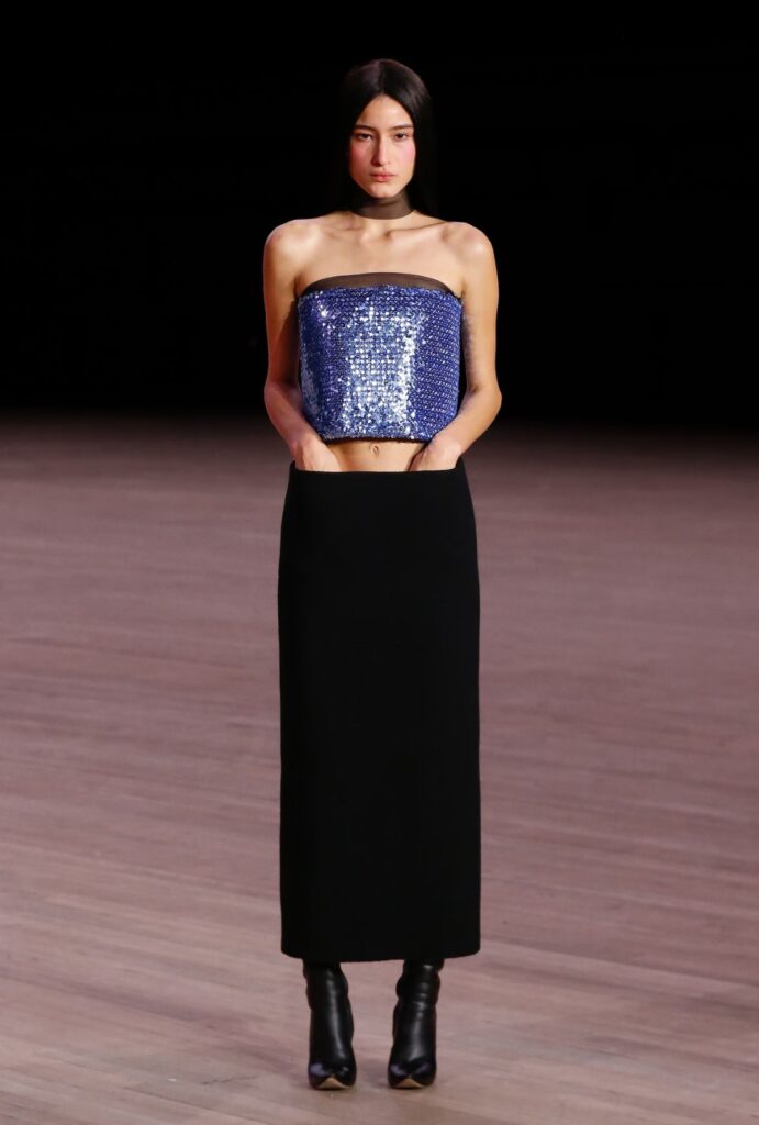 El desfile jugó con una paleta nostálgica y contemporánea a la vez. Los cuadros delicados, los neutros cálidos y los toques de lentejuelas funcionaron como ‘pensamientos preservados’: fragmentos de memoria que brillan entre lo sobrio. Las texturas, desde el lino hasta el satén, reforzaron esa sensación de archivo en movimiento, mientras la luz jugaba con cada detalle.
