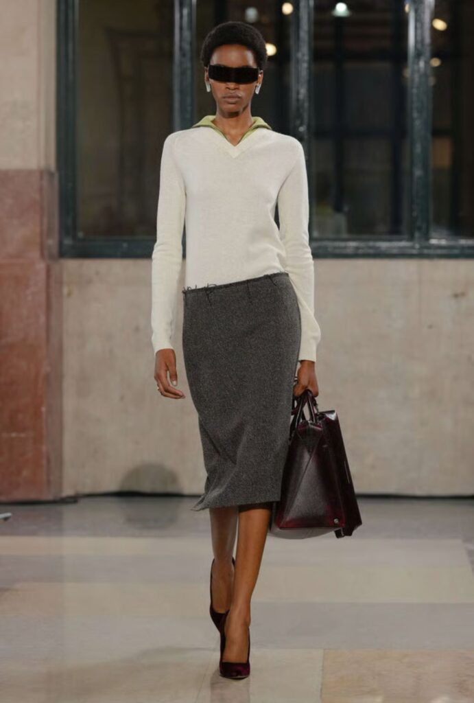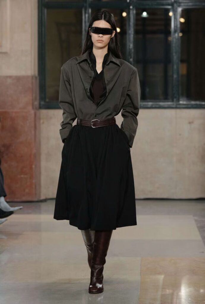 El concepto de MM6 Maison Margiela AW26 giró en torno a la distorsión de lo cotidiano; tomar arquetipos urbanos reconocibles y desplazarlos sutilmente de su eje. La colección examinó la ropa diaria como si fuera un objeto de estudio: abrigos reconfigurados, faldas que mutan en delantales, denim tratado como construcción conceptual más que como básico.