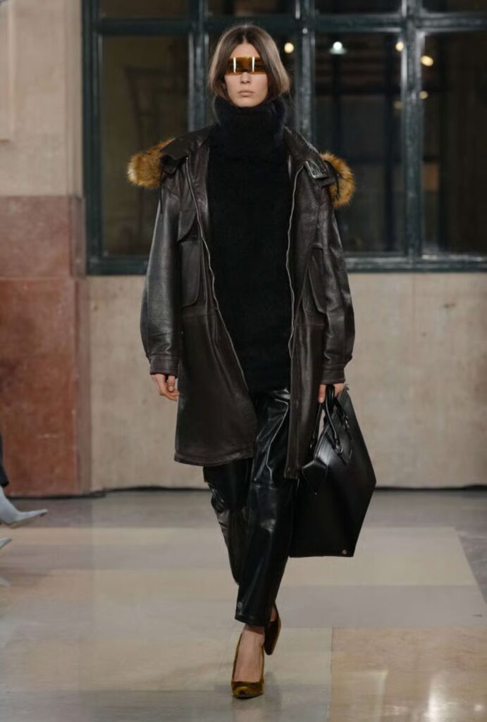 Cuero desgastado, tafetán, mohair grueso y franela convivieron en un diálogo táctil. El contraste fue más estructural que decorativo, materia sobre ornamento.
