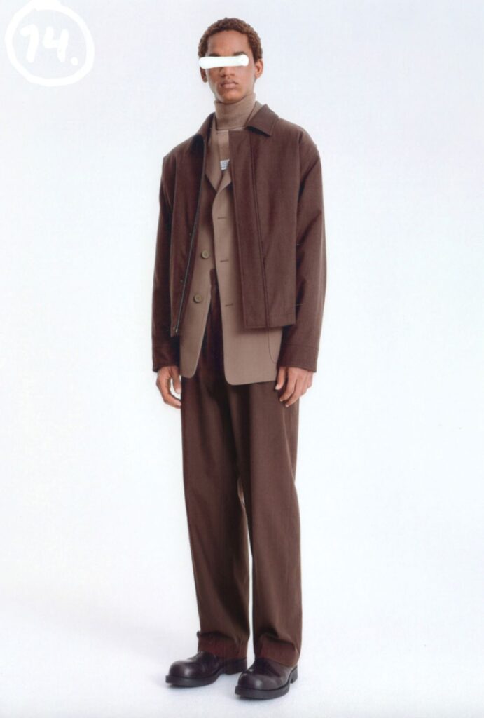Aquí, el juego está en materiales y capas. Una camisa verde caqui aparentemente clásica se descubre en cuero vegano ultrafino, desafiando la percepción táctil y visual. Una pieza varsity se reinventa como un híbrido inesperado: un jersey con mangas de lana sastrera que se funde con un chaleco de piel sintética, redefiniendo el concepto de layering. Cada prenda es un guiño a la artesanía invertida de Margiela, donde el interior y el exterior dialogan sin jerarquías.