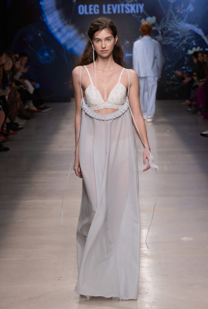 Entre lo onírico y lo urbano: ahí habita la propuesta de Oleg Levitskiy. Chalecos de felpa, abrigos oversized y vestidos translúcidos construyen una estética donde la comodidad no es opuesta al estilo, sino su punto de partida.