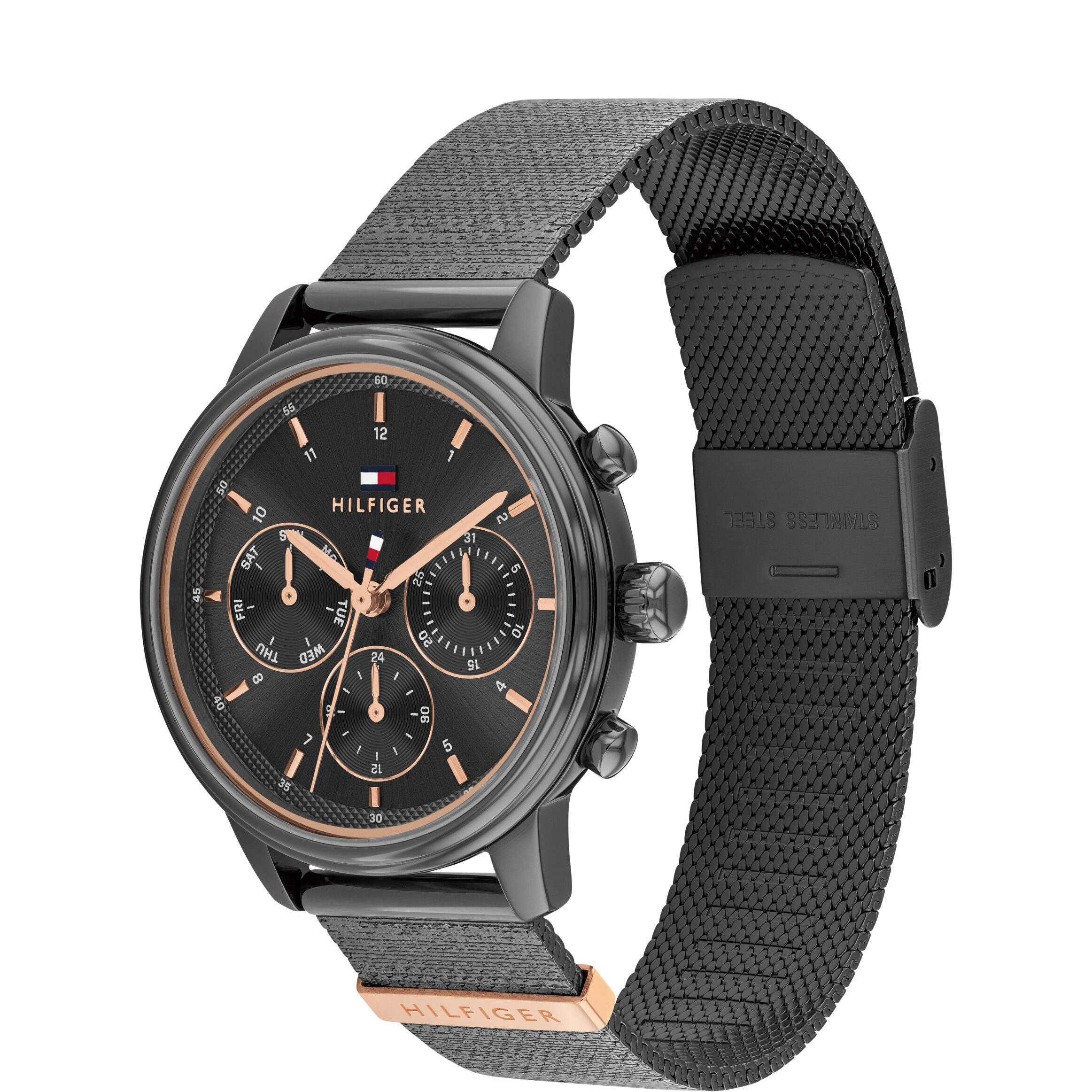 Las manecillas también son doradas rosadas y el logotipo de Tommy Hilfiger aparece bajo las 12 h. La correa es de malla en tono gris con un cierre ajustable, e incluye un detalle dorado rosado cerca de la caja que complementa el diseño.