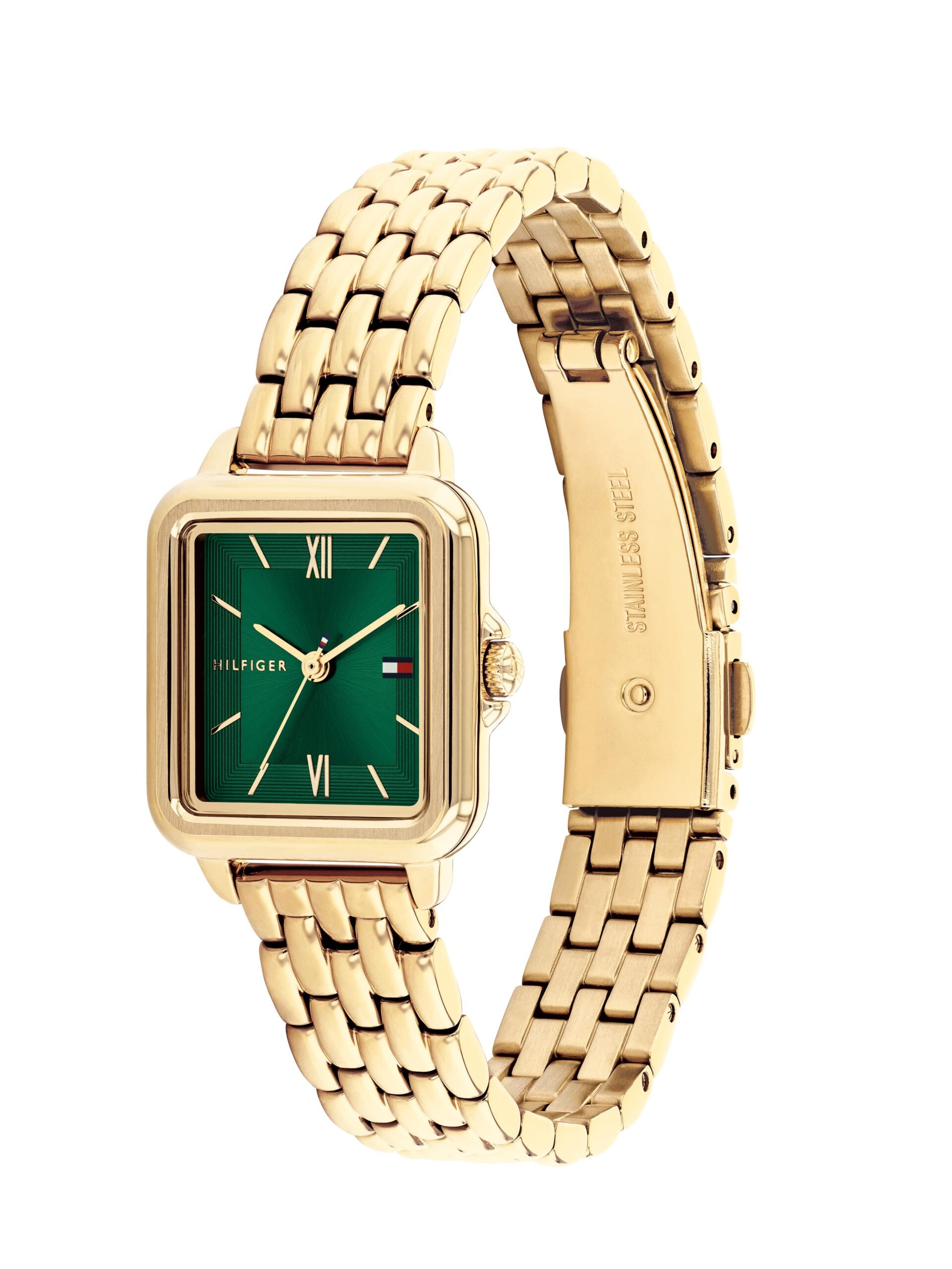 ¿Qué hora es? Hora de regalar con Tommy Hilfiger. Para ella: la opción es este reloj dorado (que además funge como pulsera) con caja cuadrada y carátula verde.