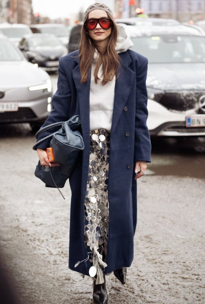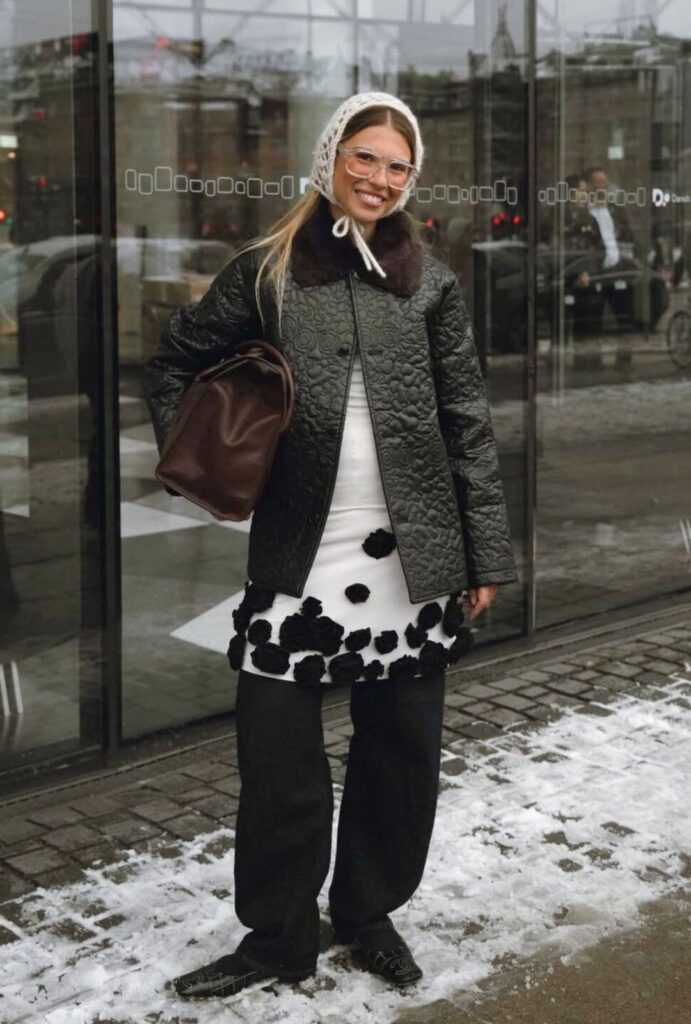 Capas, capas y más capas. Desde chaquetas oversize hasta sudaderas apiladas con precisión quirúrgica, el layering aquí no es solo funcional, es narrativa. Cada prenda cuenta algo: faldas transparentes flotando sobre vaqueros, suéteres llevados ‘por si acaso’ y abrigos que parecen esculturas urbanas. Nadie juega con las capas como las danesas (y las redes sociales lo saben).