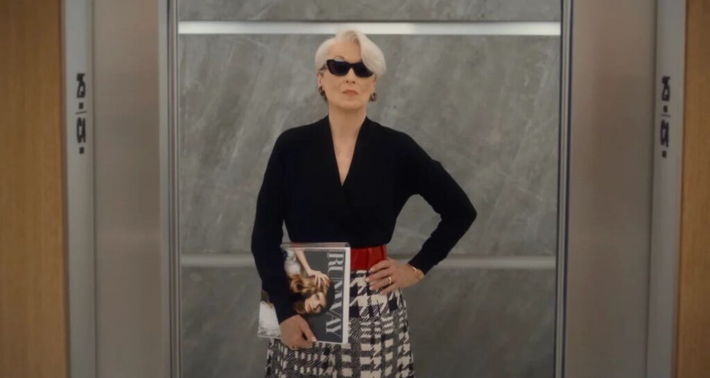 El teaser, de apenas 51 segundos, revive una escena que solo podía firmar el destino: Miranda Priestly y Andy Sachs cruzándose en un ascensor. La tensión, intacta. El silencio, perfectamente coreografiado al ritmo de Vogue de Madonna. Y una frase final que lo resume todo: ‘took you long enough.’