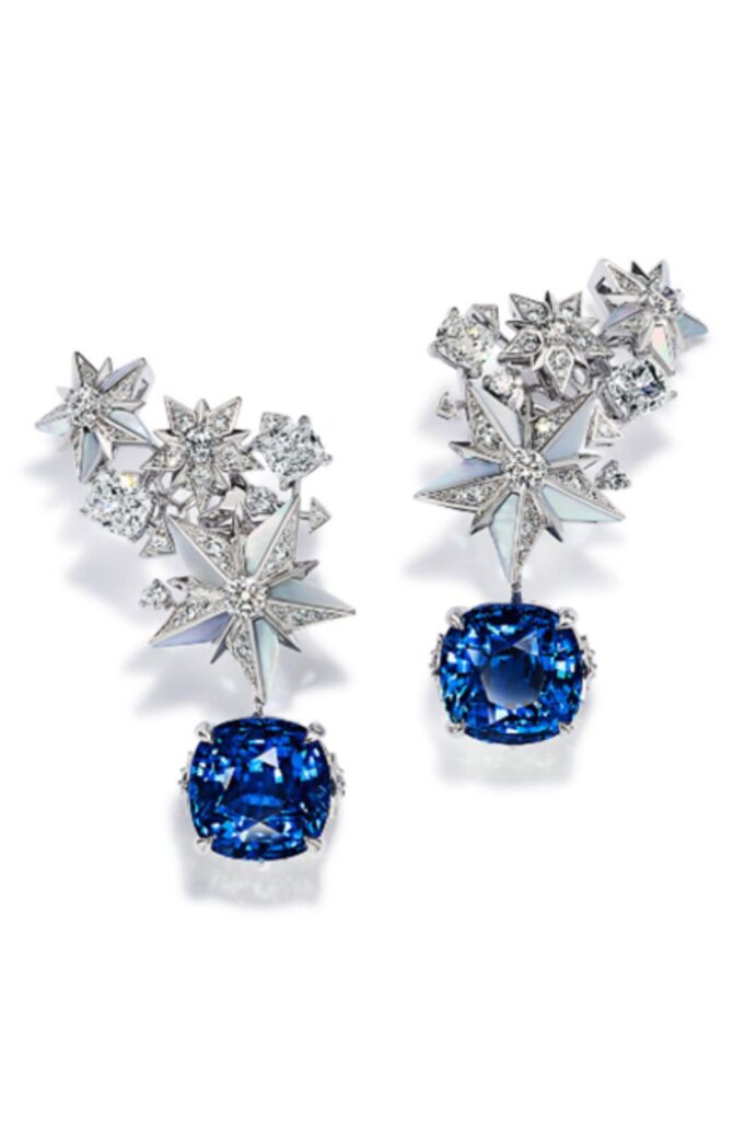 Para complementar el vestido y reforzar el motivo azul, Zendaya eligió joyas de Tiffany & Co. que destilan lujo y sofisticación. Los pendientes en platino con zafiros y diamantes de 27 quilates capturaron la luz con cada movimiento, mientras que los anillos en platino con zafiros de siete y diez quilates rodeados de diamantes aportaron un toque de brillo extra sin robar protagonismo al vestido.