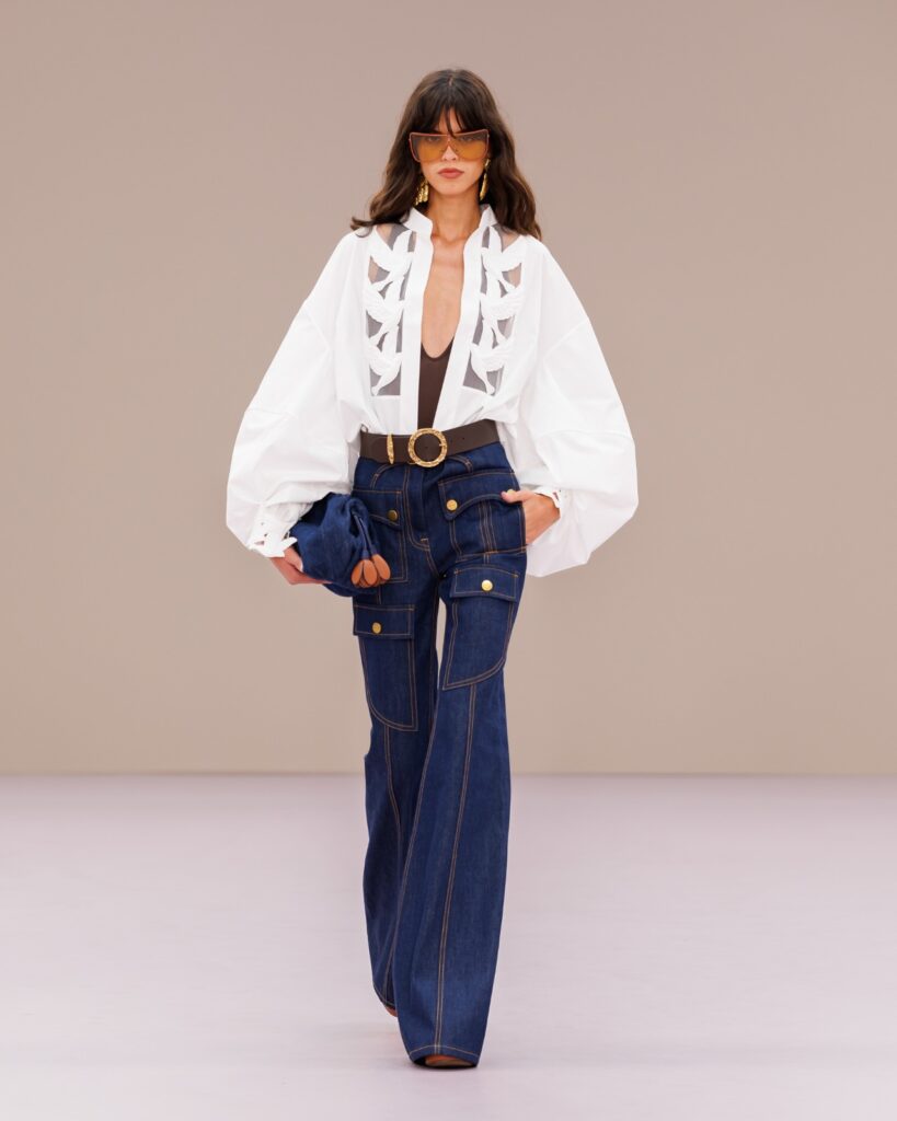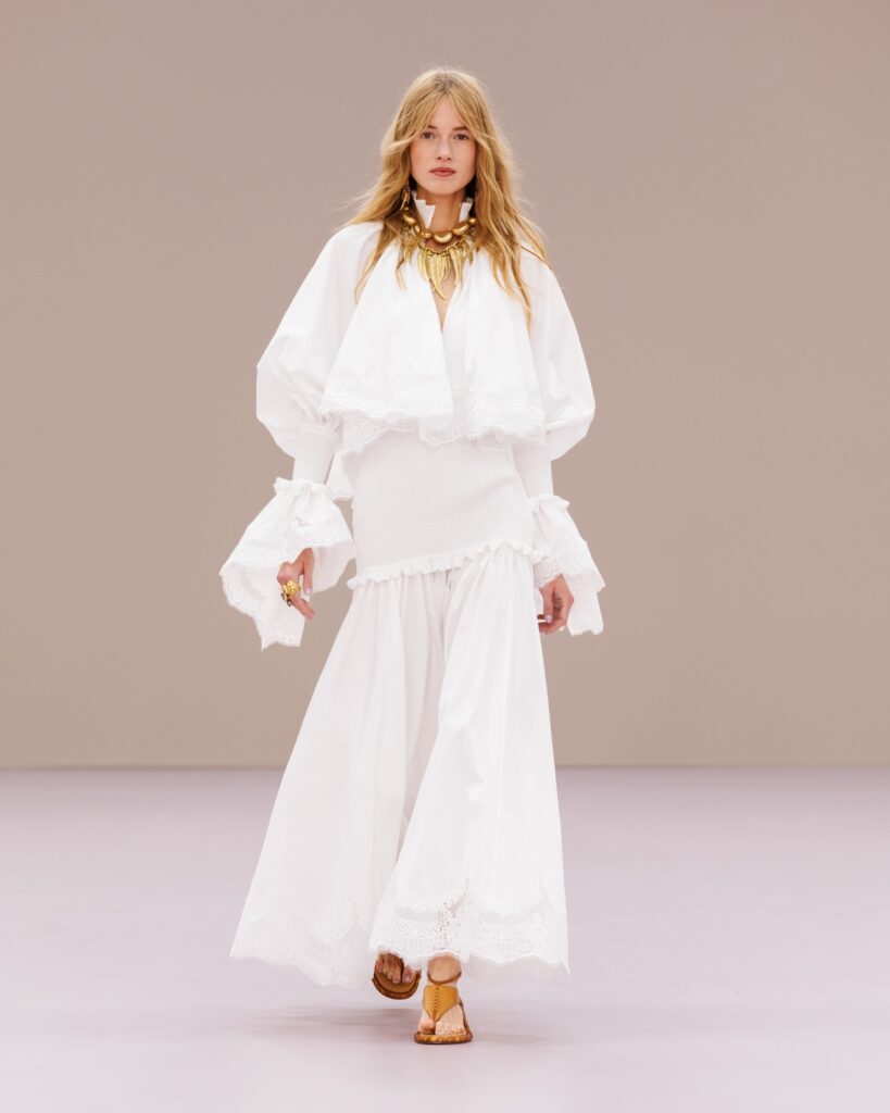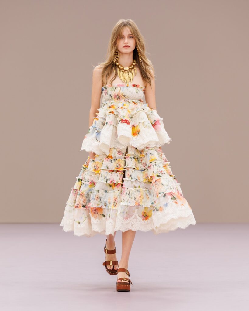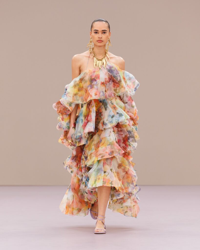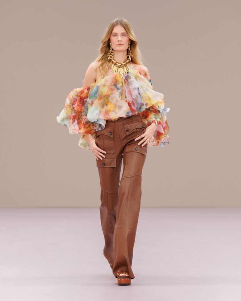 El look de apertura del desfile cautiva con su silueta en cascada, fiel a los códigos de Zimmermann de volumen cuidado y movimiento dramático. Las faldas se despliegan desde la cintura, dominando el espacio; las mangas se abullen en capas, los tops peplum sin tirantes flotan y las campanas cilíndricas rebotan al andar.