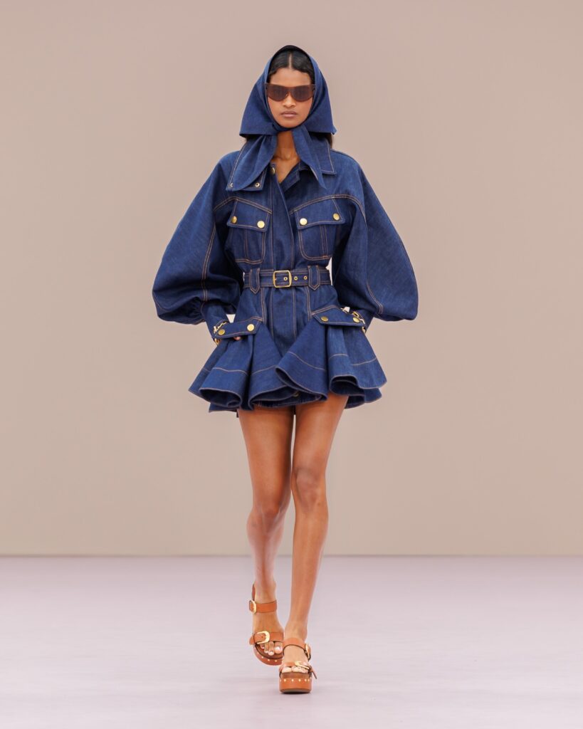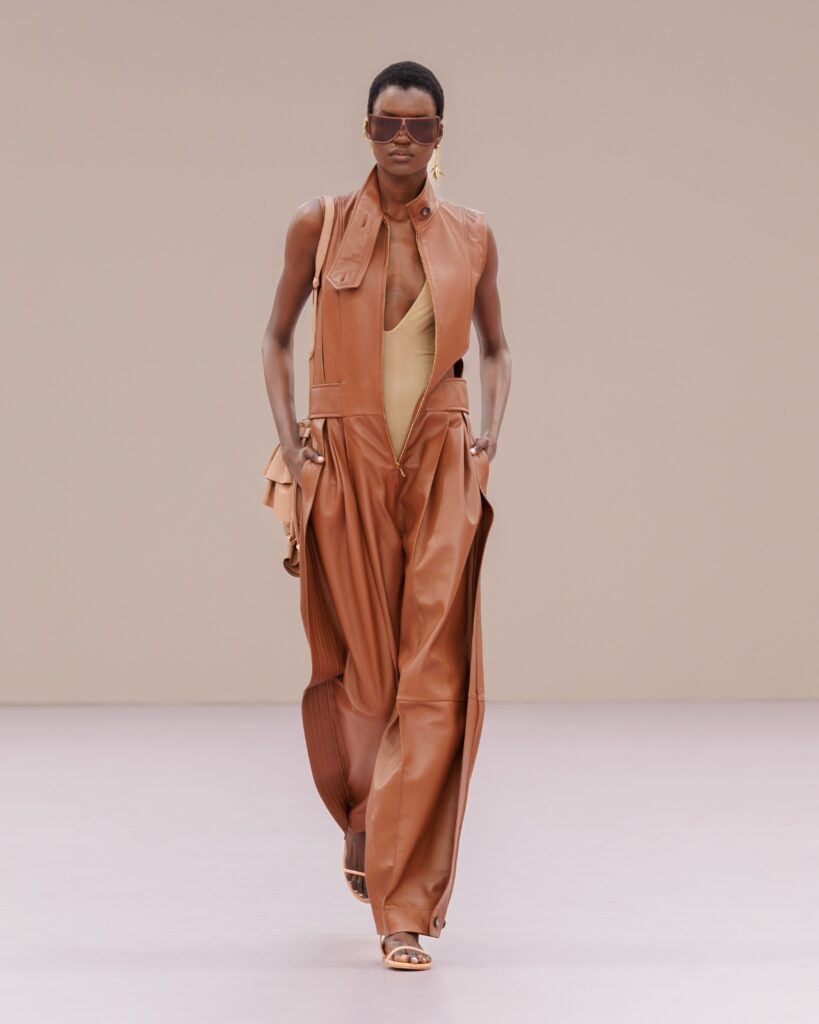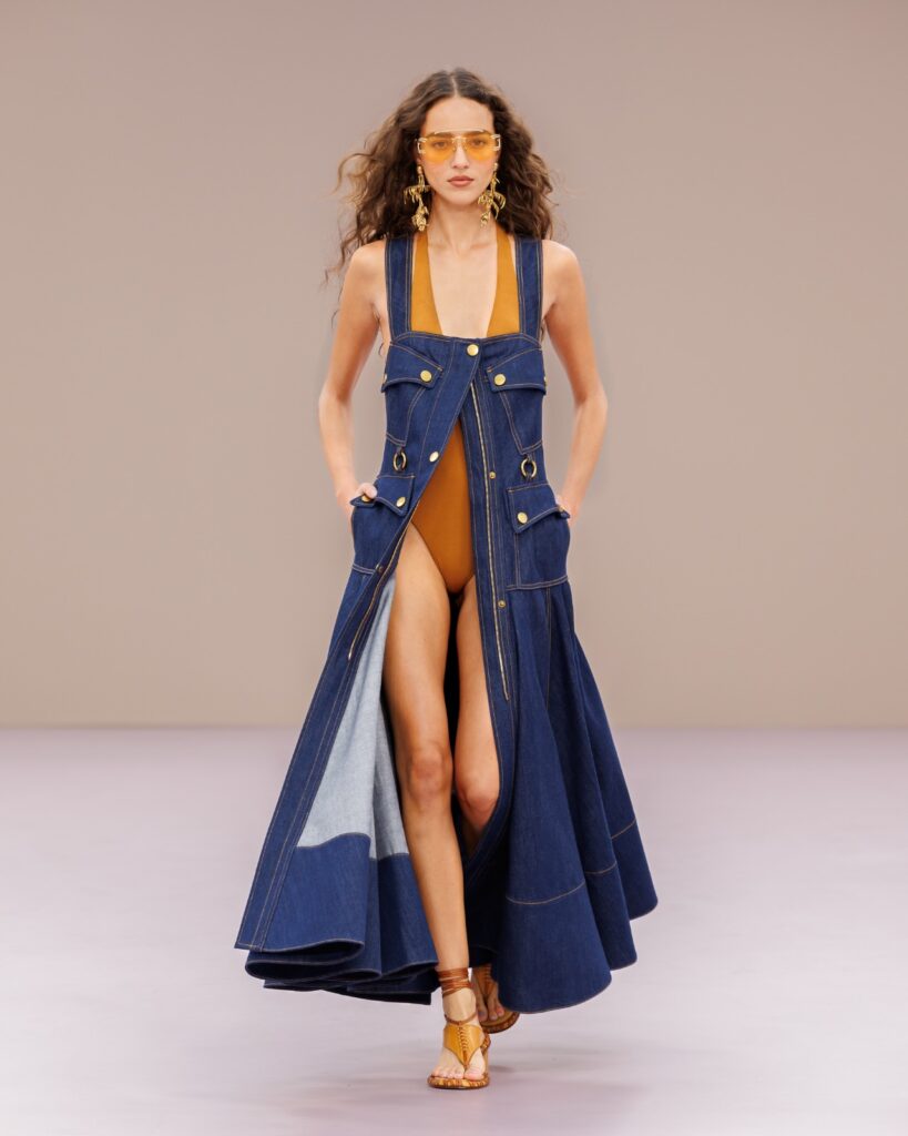 También tuvo iteraciones de overoles de pintor en sarga de algodón y cuero tostado, revelando un body escotado, una pieza conocida de superposición de Zimmermann.