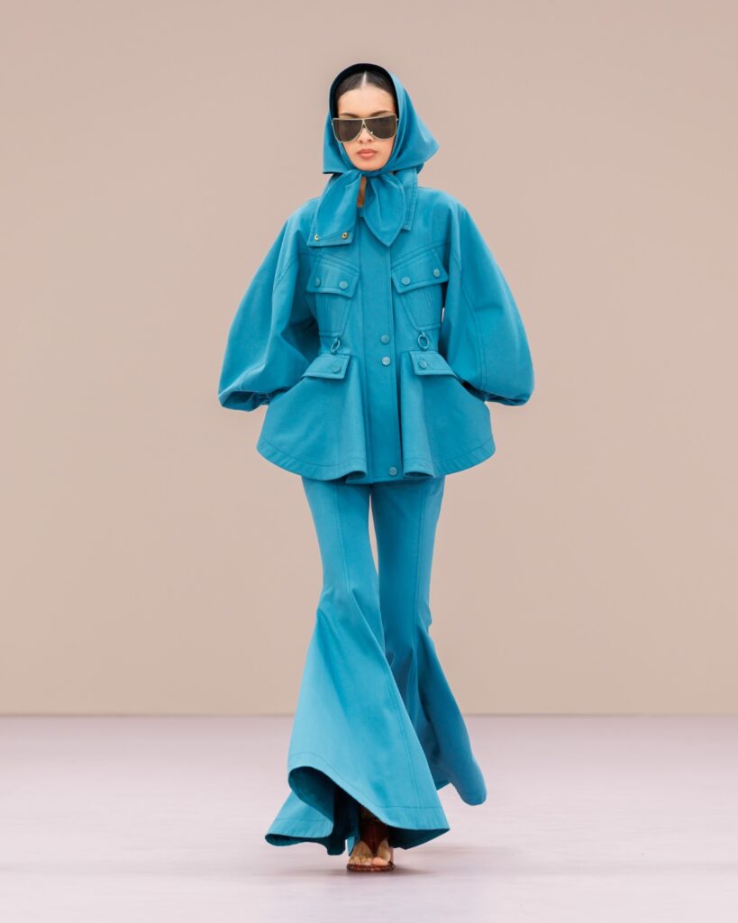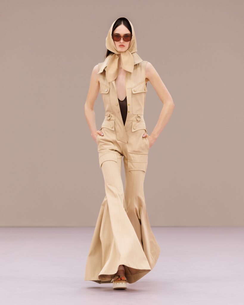Mientras que las siluetas en drill de algodón de color sólido sobresalen, trascendiendo la utilidad en chaquetas que se abren en la cintura y pantalones súper acampanados con esa oda a los años 70.